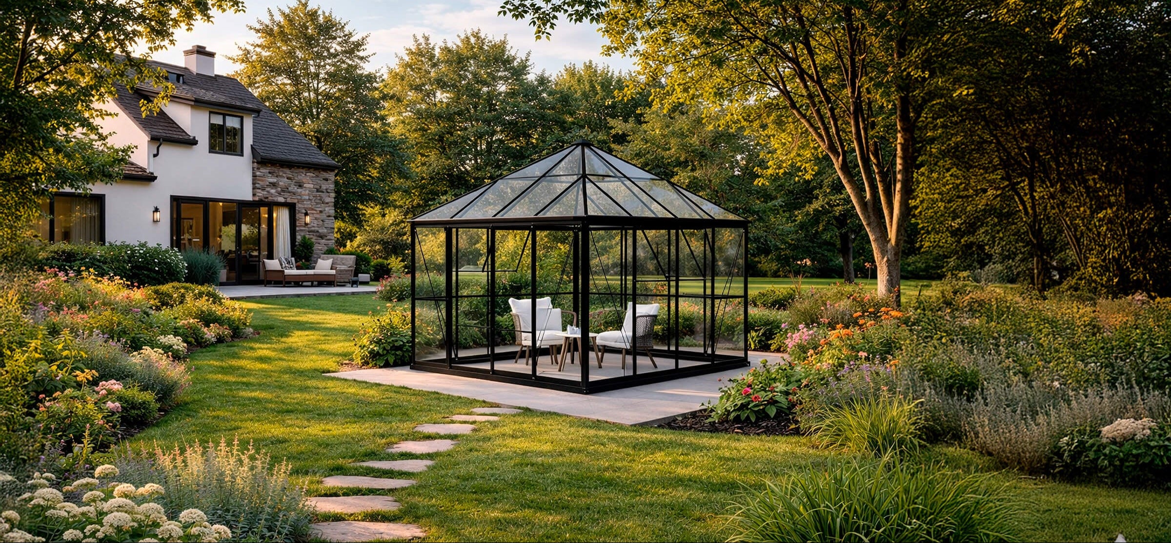An orangery is the perfect solution if you dream of an elegant outdoor space for relaxation, growing plants, and enjoying your garden all year round. With an orangery, you get a bright, sheltered area where you can sit protected from the wind and rain while still enjoying views of your garden and the surrounding landscape. An orangery can be a large greenhouse, offering space for both plants and comfortable furniture. Its classic design adds style and atmosphere to any garden, and becomes even more beautiful when filled with lush flowers, herbs, or home-grown vegetables.