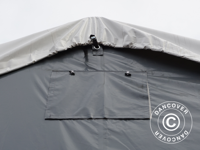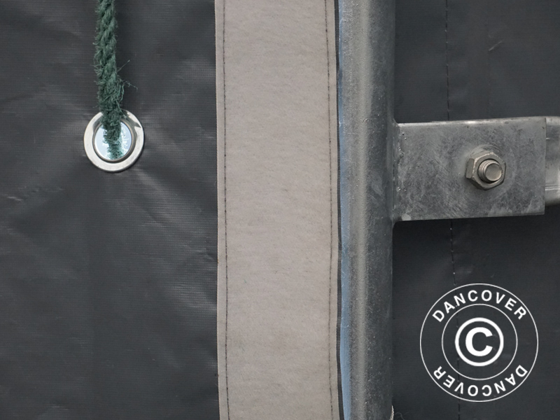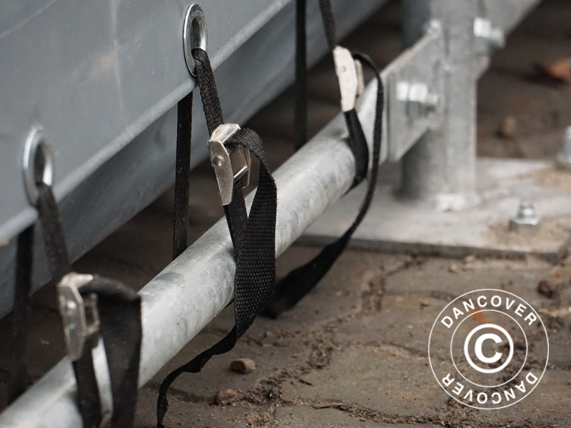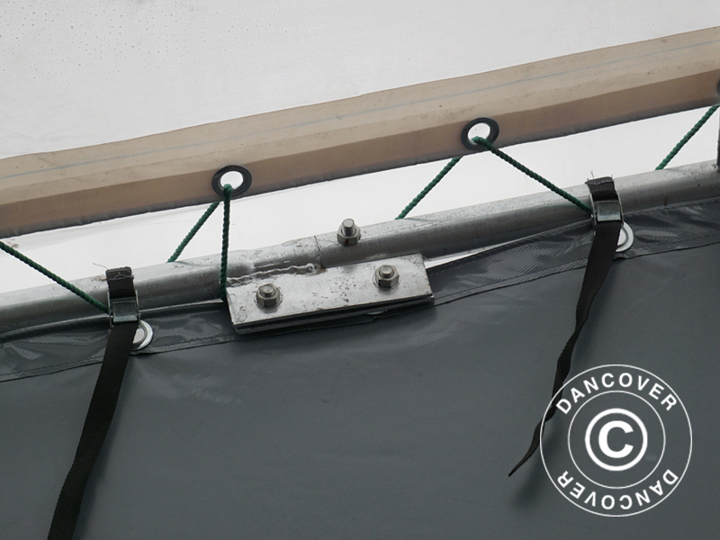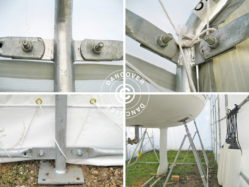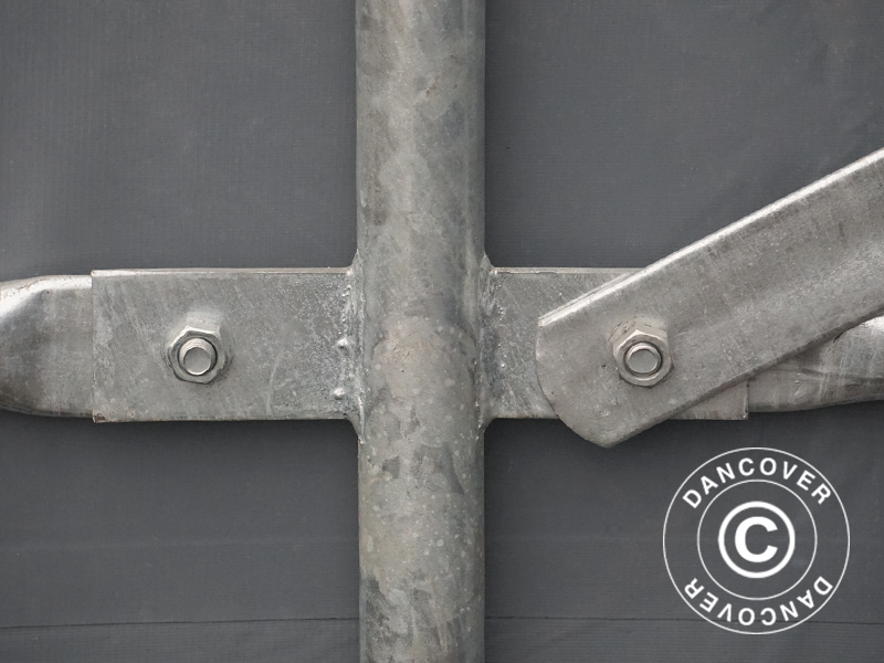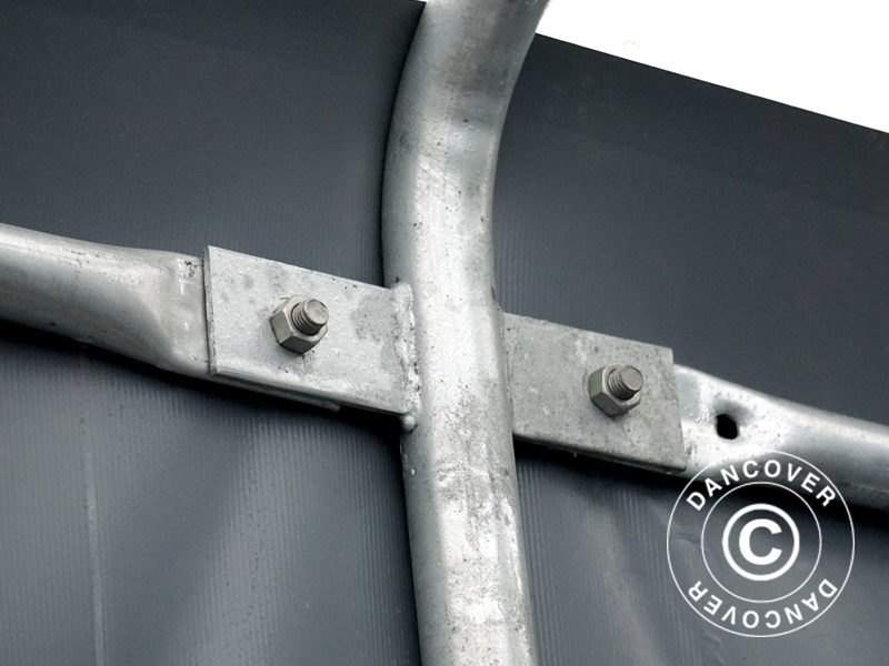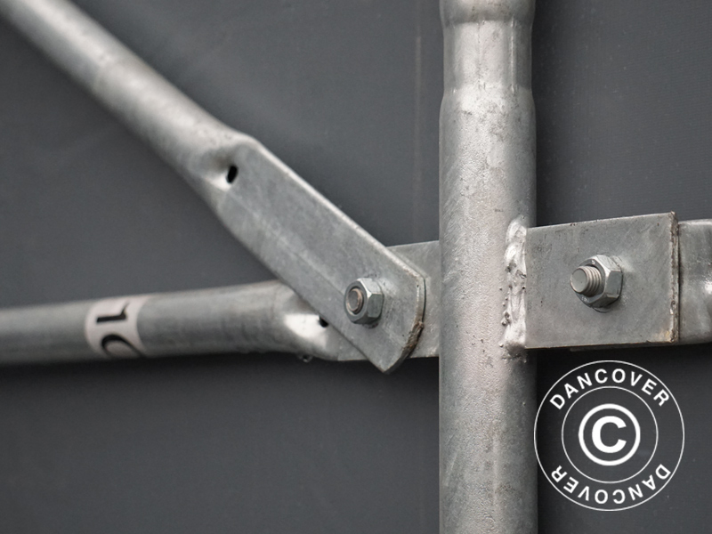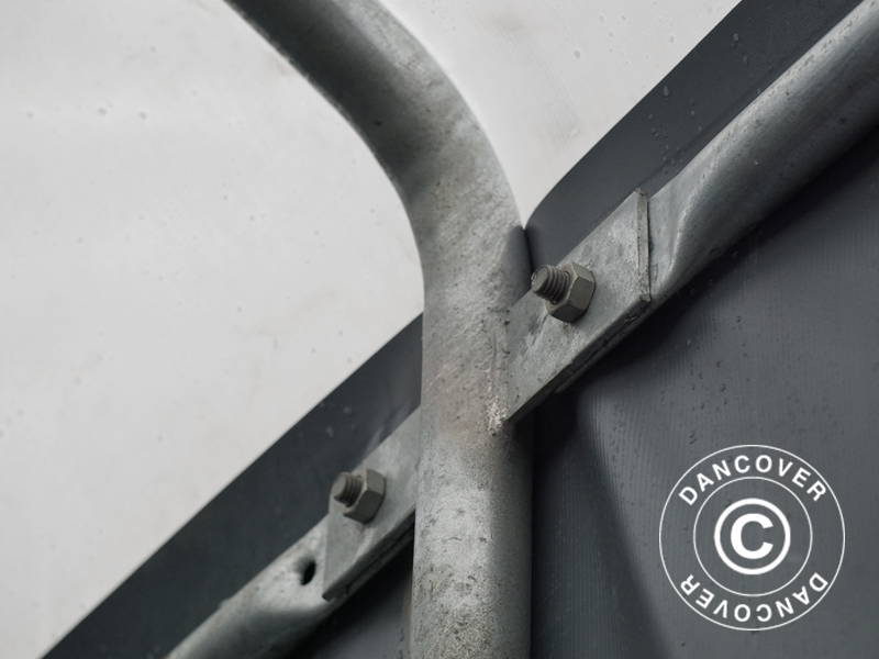 Die Lagerzelte Titanium verfügen über einen stabilen Rahmen mit feuerverzinkten Stahlrohren, um die Langlebigkeit zu ermöglichen, für welche die Dancover-Produkte so beliebt sind. Der Rahmen kann leicht mit robusten Schrauben und Muttern montiert werden. Der Rahmen wird durch Windkreuze aus Stahl für die Seiten- und Giebelwände verstärkt. Die ganze Struktur muss mit den beigefügten, robusten Bodenankern gesichert werden. Die elegante Plane des Lagerzeltes Titanium ist aus strapazierfähigem, flammfestem 600 g/m2 PVC hergestellt.