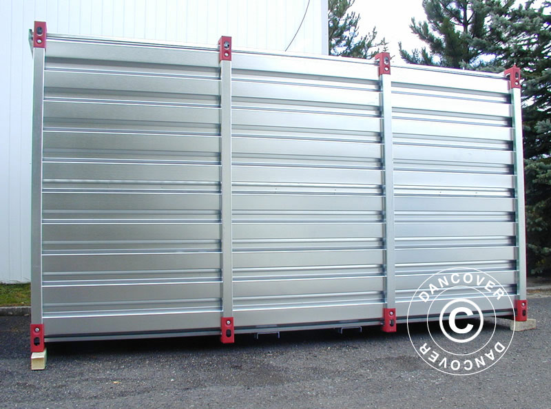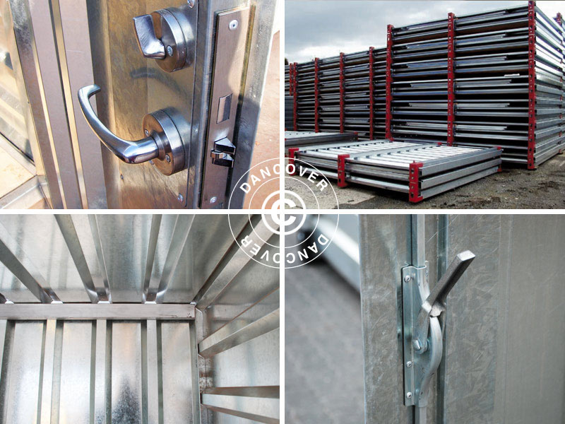 Den solide og fleksible materielcontainer er den oplagte løsning, når du skal bruge sikker og fleksibel opbevaring udendørs eller indendørs. Containeren kan nemt samles og adskilles ved hjælp af de medfølgende bolte. Det betyder, at du altid har mulighed for at tilpasse din opbevaringskapacitet i forhold til det ofte omskiftelige behov. Væggene på containeren består af 0,75 mm tykt, bølget, galvaniseret stål. Siderne er nittet til en stålramme bestående af 2 mm galvaniseret stål – samt hjørner i 3 mm stål.