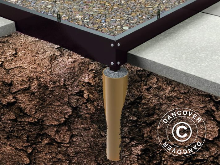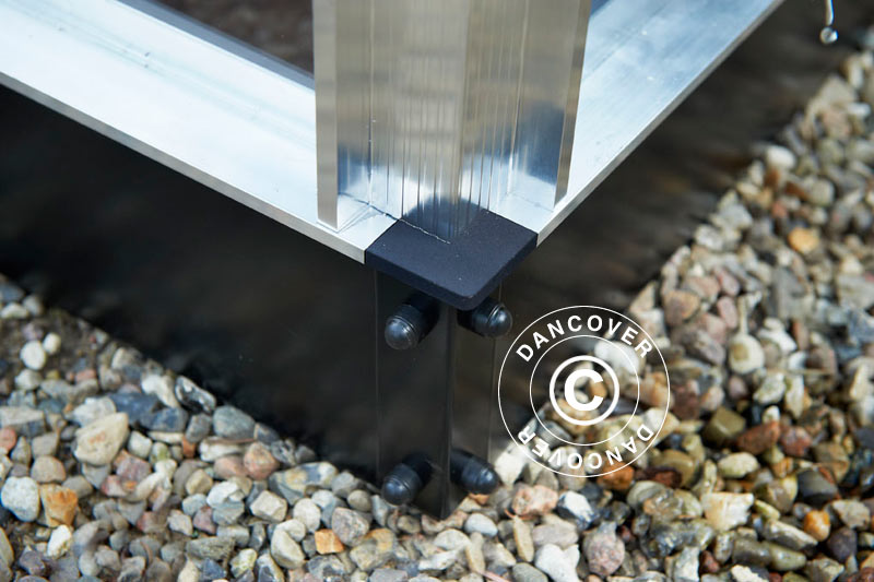 Det er vigtigt, at din drivhussokkel monteres 100 % vandret og at drivhuset er i lod og vinkel. Den galvaniserede stålsokkel monteres på ben, der er nedstøbt i jorden. Så er soklen stabil og sikkert forankret. Derefter monteres drivhuset på soklen. Der skal ikke bruges specialværktøj til montering m.m.