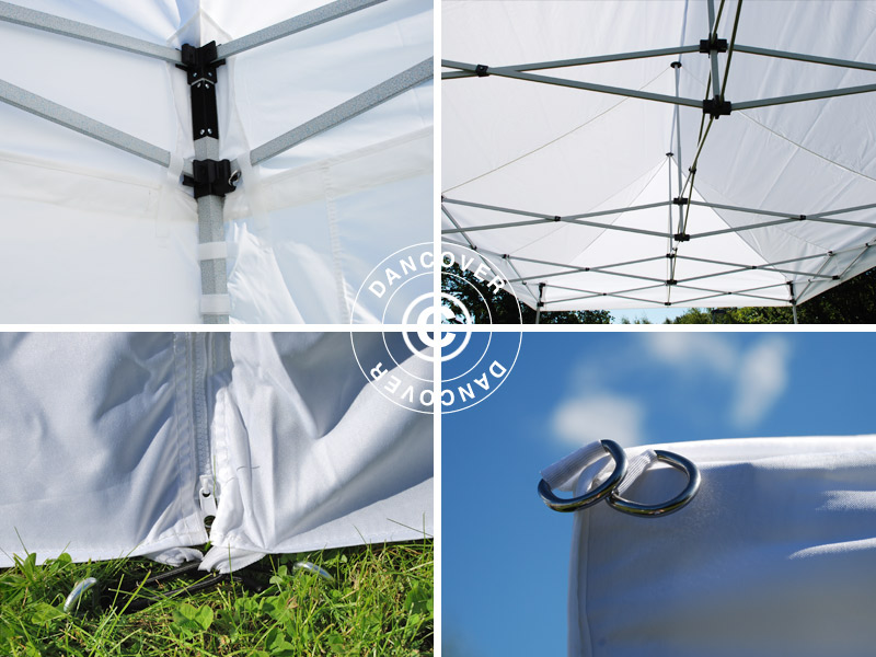 Dugen er lavet af stærk polyester i høj kvalitet med en kraftig PVC bagside, som er både vandtæt, UV-modstandsdygtig, smudsafvisende og vaskbar! Siderne monteres på enkel vis med stærke Velcro bånd på indersiden af tagdugen og lynes sammen i hjørnerne på teltet.