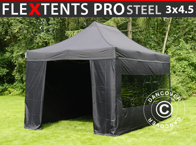 Brzo sklopivi paviljon FleXtents PRO Steel 3x4,5m, Crna, uključ. 4 bočne stranice