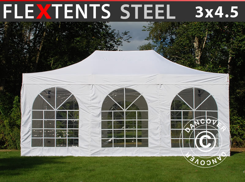 Brzo sklopivi paviljon FleXtents Steel 3x4,5m, Bijela, uključ. 4 bočne stranice