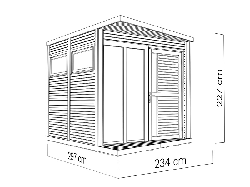 Deze moderne en stijlvolle houten blokhut of tuinpaviljoen is perfect voor recreatieve doeleinden, als kantoor buiten of om familie en vrienden te laten logeren. De brede deur zorgt voor een makkelijke toegang en de grote ramen van vloer tot plafond van gehard glas zorgen voor veel licht in de kubusvormige ruimte. De zijramen van veiligheidsglas kunnen worden geopend voor ventilatie. Alle panelen en onderdelen zijn geheel prefab voor eenvoudige opbouw en zagen is niet nodig. De vochtbestendige vloer zijn inbegrepen! De deur is af te sluiten met een ingebouwd cilinderslot.