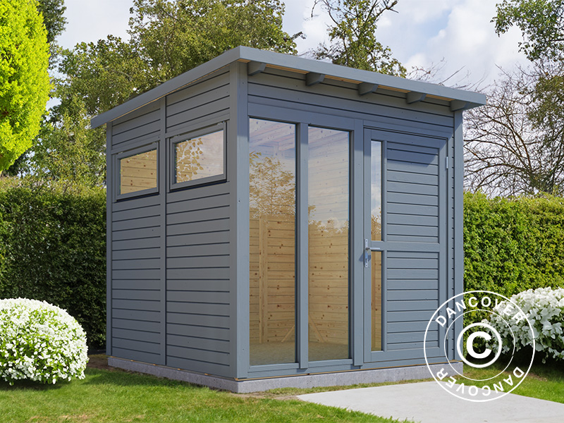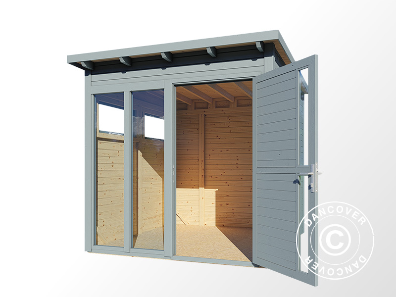 Een stijlvolle en moderne houten blokhut van stevig 19 mm dik FSC-hout afkomstig van verantwoorde bronnen. De blokhut is gemaakt van zeer stabiel, robuust en duurzaam hout met een lange levensduur, vooral als het goed onderhouden wordt. De houten blokhut heeft een dak met een helling van 2,2°, zodat het water er niet op blijft staan. Het is belangrijk dat u binnen enkele weken na de montage permanente dakbedekking of shingles aanbrengt. Let op – dakbedekking wordt niet meegeleverd!