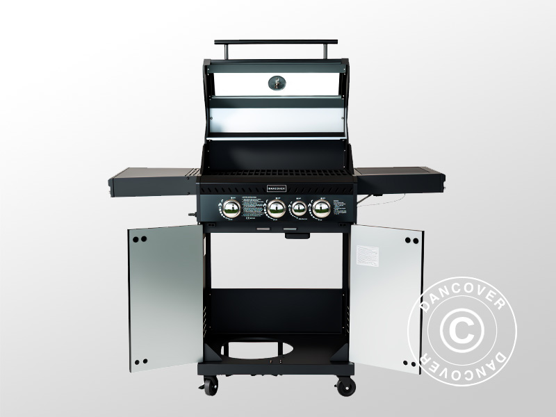 Grillen är utrustad med ett underskåp med frontluckor i tvålagers stål och sidobord med praktiska krokar för ditt grillredskap. Den solida kontrollpanelen, de blanka reglagen och de robusta hjulen kompletterar denna användarvänliga och eleganta gasolgrill.