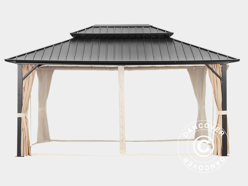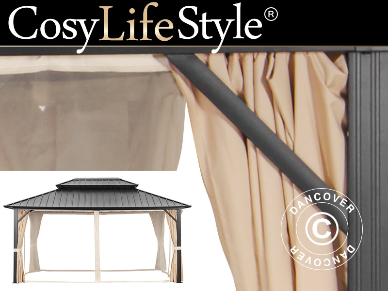 Sidewall kit with 4 sidewalls for the elegant garden gazebo San Francisco 3,65x4.85 m. The sidewalls or curtains are ecru and made of 140 g/m² polyester. The soft and flexible sidewalls will make your gazebo even more inviting and you can use the gazebo for even more purposes with shade, shelter, and privacy. Note! Mosquito net is not included.