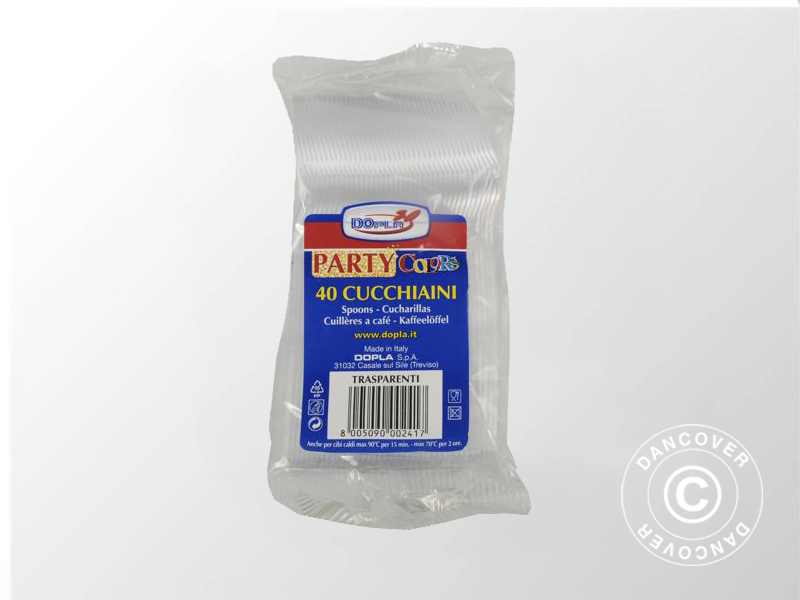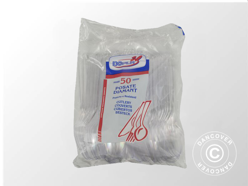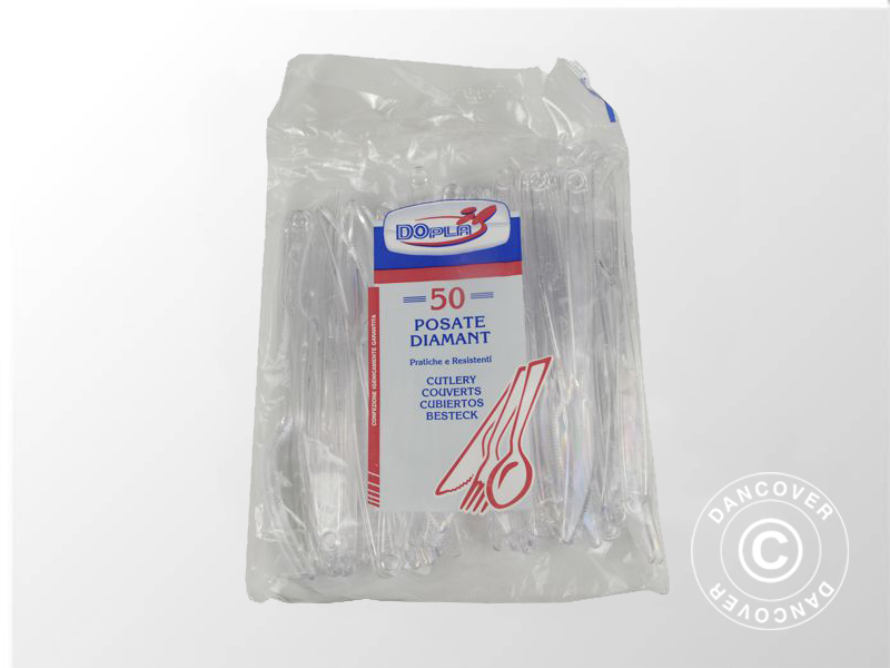 Plastic cutlery, disposable, for the party, picnic or the professional event. Regardless of the occasion, it is easy and fast to use this disposable cutlery. Another advantage is of course that it will be very easy to clean up after the dinner or party and avoid the washing-up. The set consists of knives, forks, spoons and coffee spoons.